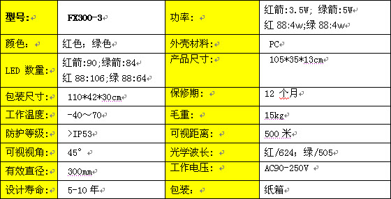 FX300-3-RYG 三單元箭頭帶倒計(jì)時(shí)組合LED交通信號(hào)燈 采用超高亮度發(fā)光二極管芯片AlInGaP和InGaN作為產(chǎn)品的光源,低功耗,長(zhǎng)壽命,維持產(chǎn)品合理成本。
